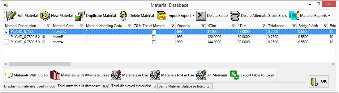 Add your materials to the material database. In this example, PLYWD_0.7500 is the main material and the other two are the alternates.