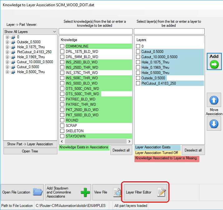 By selecting the 'Add Advanced Nesting Associations' button, Router-CIM Automation Suite will search your knowledges to find the STAYDOWN, COMMONLINE, SKELETON and PIN_TRIM knowledges and automatically create the layer-to-knowledge association. This button also works if your STAYDOWN, COMMONLINE, SKELETON and PIN_TRIM knowledges begin with the Material Code.