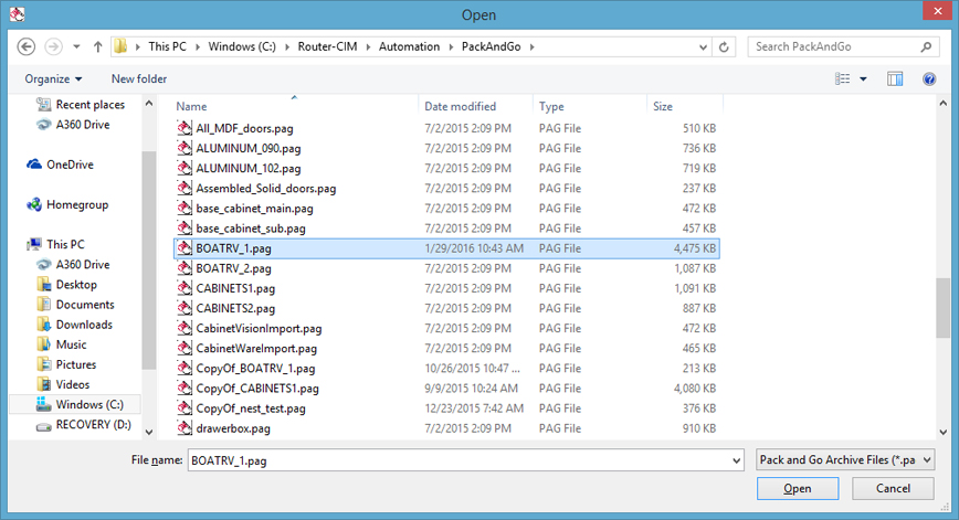 Pack and Go is the Router-CIM Automation Suite format for packaging all the elements of a job into one file.  To import that file into Router-CIM Automation Suite as a job, select pack and go from the import list, and a window will appear where you can select the PAG file from.