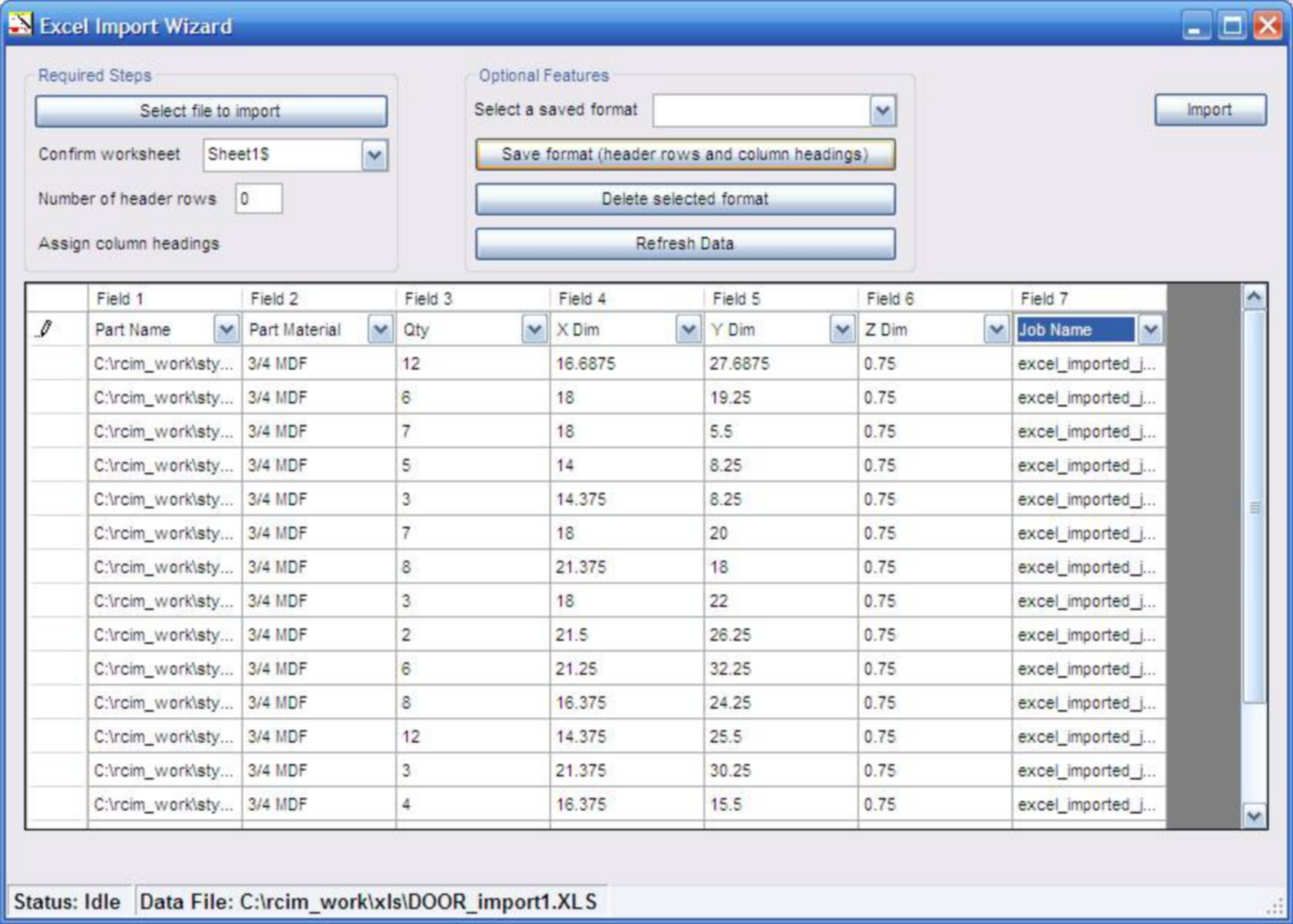 The format you set as default will be used to map out the XLS or XLSX file you selected. Router-CIM Automation Suite will build a job using the job defaults you set up in the first step, and then import the XLS or XLSX knowing what data is in each column because of the default import format that you set in step four.